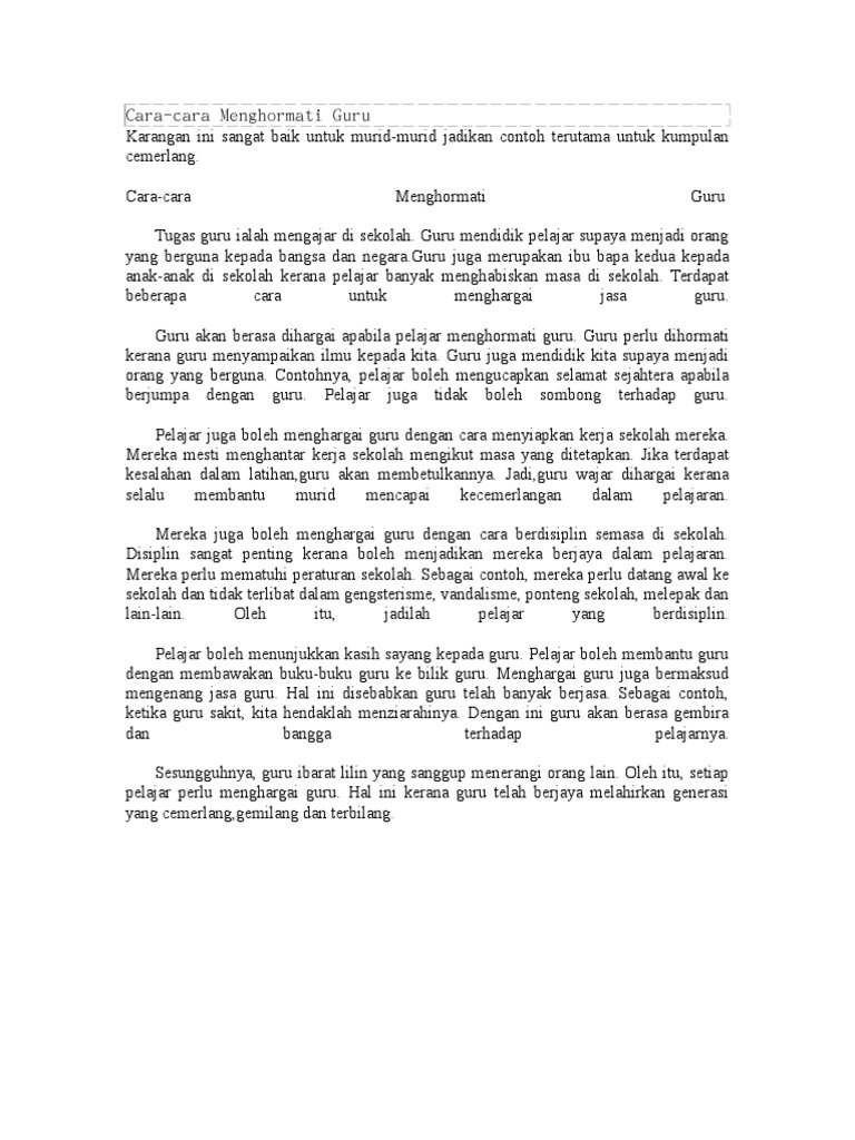 Bahkan terdapat dalil yang memberi contoh cara menghormati guru. Contoh Karangan Cara-cara Menghormati Guru Cara-cara Menghormati Guru Contoh Karangan 1 Semasa kita berada di sekolah gurulah yang menjaga dan mendidik kita. Salah satu caranya adalah dengan mengucapkan salam ketika kita bertemu dengan guru.
